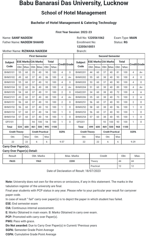 Bachelors of Hotel Management Catering and Technology (BHMCT) - 1st Year Result